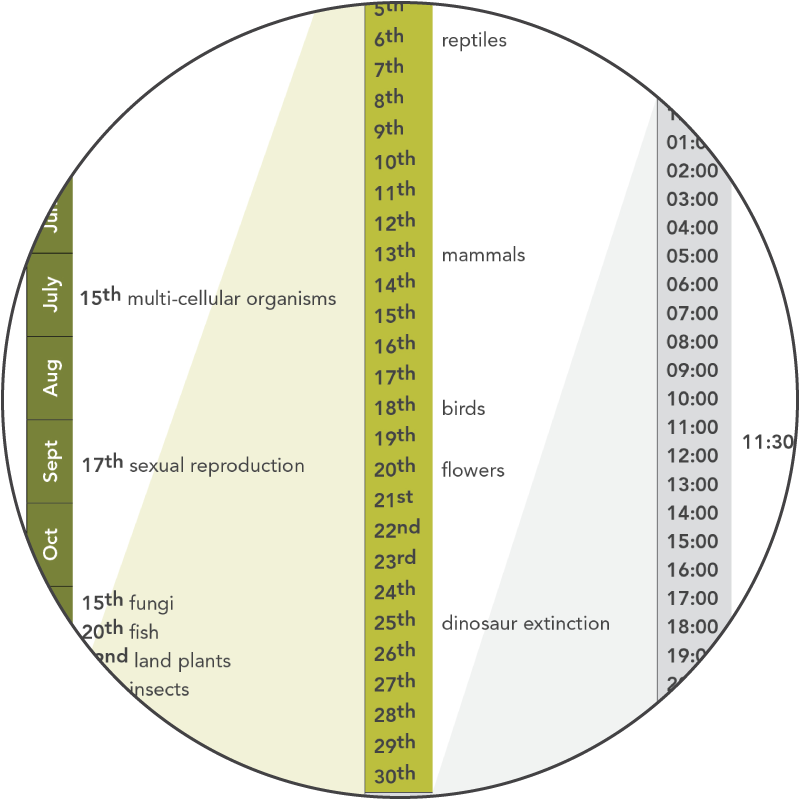 Earth’s Calendar Year plainly shows our age as a species relative to the much, much older forms of life on Earth. And it helps us see that our story is but a tiny part of the Earth’s story. (The sun isn’t expected to burn out for another 5 billion years, so maybe now is Earth’s slightly premature “mid-life” crisis!).