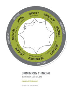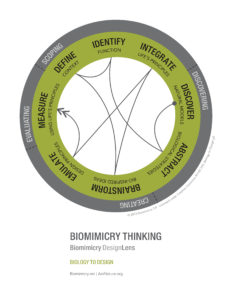 Biomimicry Thinking provides context to where, how, what, and why biomimicry fits into the process of any discipline or any scale of design. While akin to a methodology, Biomimicry Thinking is a framework that is intended to help people practice biomimicry while designing anything. There are four areas in which a biomimicry lens provides the greatest value to the design process (independent of the discipline in which it is integrated): scoping, discovering, creating, and evaluating. Following the specific steps within each phase helps ensure the successful integration of life’s strategies into human designs.
